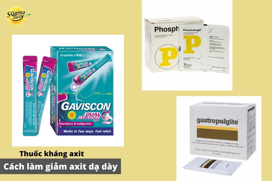 - Hầu hết các bác sĩ đều khuyên dùng thuốc kháng axit không kê đơn như một phương pháp phòng vệ đầu tiên chống lại chứng ợ nóng và trào ngược. Một loại thuốc như phosphalugel, gaviscon… có thể giúp giảm nhanh chóng (trong vòng vài phút) đối với trường hợp ợ chua. Nhưng giống như hầu hết các loại thuốc thông thường, thuốc này được sử dụng để điều trị một triệu chứng chứ không trị dứt điểm được nguyên nhân gây ra bệnh.
