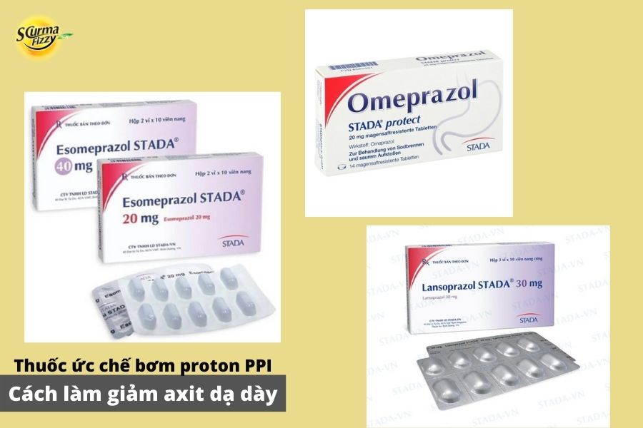 - Loại có tác dụng mạnh nhất của các loại thuốc giảm tiết axit là thuốc ức chế bơm proton . Các loại thuốc này hoạt động bằng cách ức chế không hồi phục một loại enzyme là H+/K+ ATPase được tìm thấy trong thành bên của niêm mạc dạ dày, từ đó giảm tiết hoàn toàn axit dạ dày.