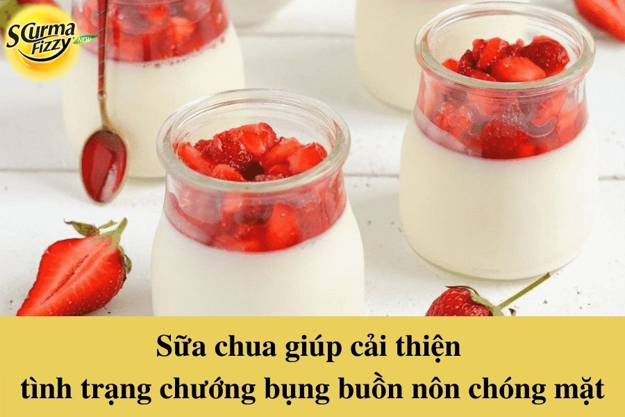 Sữa chua có chứa axit lactic, giúp cải thiện chứng đầy hơi, khó tiêu. Bởi vậy đây cũng là một thực phẩm chúng ta có thể bổ sung để đẩy lùi chứng chướng bụng buồn nôn chóng mặt.