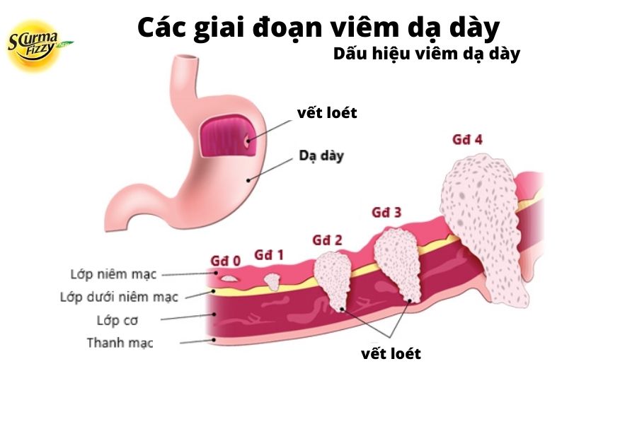 Nói một chút về cấu tạo của dạ dày. Thành dạ dày có 5 lớp, tính từ ngoài vào trong bao gồm: lớp áo thanh mạc, tấm dưới thanh mạc, áo cơ, tấm dưới niêm mạc và niêm mạc. Trong bệnh lý viêm dạ dày có thể chia thành những bệnh lý nhỏ tiến triển theo mức độ nặng của tình trạng ổ viêm. Vết viêm loét càng sâu, càng ăn ra ngoài thì tình trạng viêm càng trầm trọng hơn. Tráng trong lòng dạ dày, trên bề mặt lớp niêm mạc là một lớp chất nhầy có tác dụng bảo vệ niêm mạc dạ dày khỏi acid dịch vị HCl hay bảo vệ niêm mạc khỏi tác dụng tiêu hóa của các enzym trong dạ dày điển hình là pepsin.