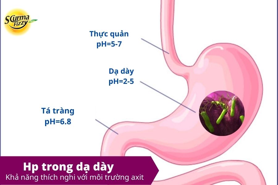 Vì vậy, để thiết lập quá trình lây nhiễm vi khuẩn Hp phải tồn tại trong môi trường axit cao của dạ dày.