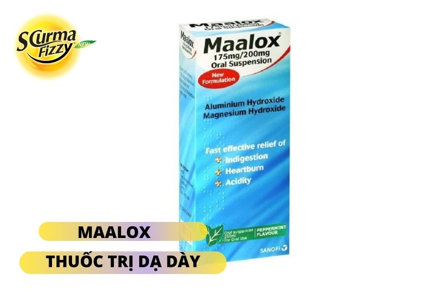 – Thuốc trị dạ dày Maalox 175 mg/ 200 mg do Công ty Sanofi Aventis sản xuất. Thành phần của 5 ml hỗn dịch uống Maalox gồm 175 mg Nhôm hydroxyd và 200 mg Magie hydroxyd. Thuốc dạng hỗn dịch có màu trắng, dùng đường uống, trước khi dùng cần lắc đều.