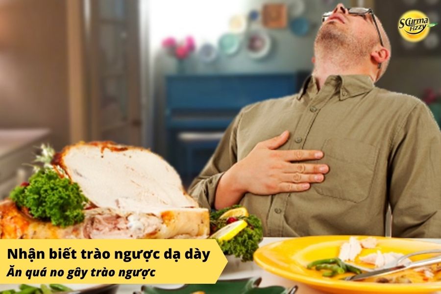 Ăn quá no hoặc ăn quá nhiều các loại thực phẩm khó tiêu (đồ ăn nhanh, nước có gas, sữa, trứng, …) có thể làm dạ dày quá tải và gây ra tình trạng trào ngược