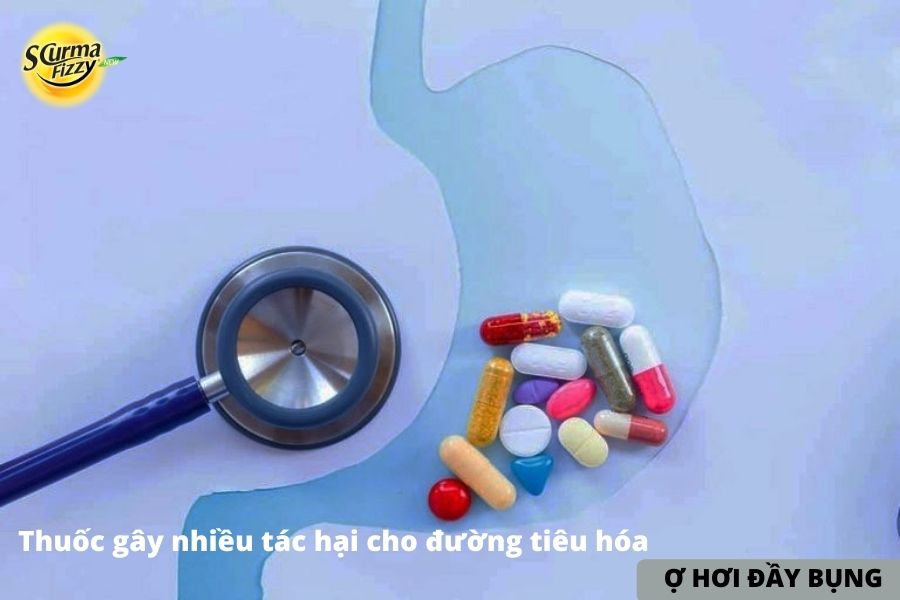 Nhóm thuốc NSAID ( thuốc giảm đau, hạ sốt như paracetamol, ibuprofen, naproxen, diclofenac,…) : những thuốc này đều có tác dụng phụ chủ yếu trên đường tiêu hóa do ức chế enzyme COX-1 làm cho dạ dày giảm tiết chất nhầy và các yếu tố bảo vệ nên khi acid dạ dày tiết ra chúng sẽ tấn công niêm mạc, dạ dày dễ bị tổn thương dẫn đến tiêu hóa kém đi, thức ăn không được tiêu hóa tích tụ lại gây ợ hơi đầy bụng.