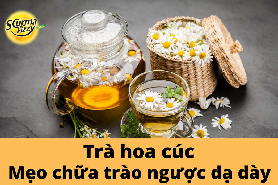 Hoa cúc là thảo mộc có vị cay, hơi đắng, tính mát giúp thanh nhiệt giải độc, cải thiện các vấn đề liên quan dạ dày và đường tiêu hóa. Trong trà hoa cúc chứa các thành phần như: tinh dầu bisabolol có tác dụng chống viêm, kháng khuẩn, chống dị ứng tốt, apigenin có khả năng ức chế ngăn chặn tế bào ung thư phát triển. Nhiều ý kiến từ các chuyên gia cho rằng khả năng kháng viêm của trà hoa cúc không hề kém cạnh so với các loại thuốc NSAID không kê đơn ( như aspirin hay ibuprofen). Trà hoa cúc còn nổi bật với tác dụng an thần, giảm lo âu, bồn chồn, góp phần giảm căng thẳng – là nguyên nhân gây tăng tiết acid dạ dày. Cách sử dụng trà hoa cúc: dùng 1 nắm hoa cúc khô đem hãm với nước sôi, uống khi nước còn ấm, người bệnh được khuyến khích nên uống trà hoa cúc khoảng 30 phút đến 1 giờ trước khi ngủ hoặc khi bị trào ngược dạ dày để hỗ trợ giảm triệu chứng, đồng thời có một giấc ngủ ngon.