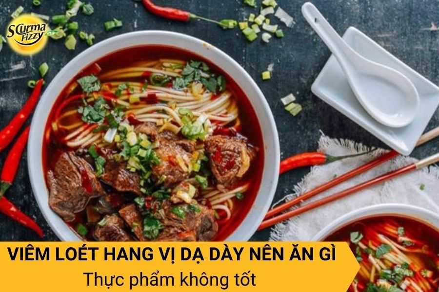 Một số thực phẩm trong nhóm thực phẩm cay nóng được khuyến cáo không nên dùng cho người bị viêm loét hang vị là thịt hun khói, thịt nướng, các món ăn chiên xào, chiên nướng, ớt, tiêu, mù tạt… Các món ăn nhanh cũng nên được loại khỏi thực đơn của người bị viêm loét dạ dày nói chung.