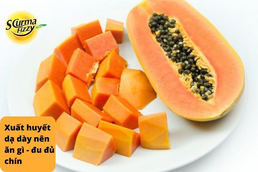 Đu đủ là một loại trái cây phổ biến ở Việt Nam, có chứa nhiều các loại vitamin như: vitamin A, vitamin B, vitamin C, canxi, photpho, magie, sắt, thiamin, riboflavin nhằm ngăn ngừa các bệnh lý liên quan đến dạ dày đặc biệt là bệnh xuất huyết dạ dày. Đồng thời, ăn đu đủ chín còn có tác dụng cho việc hỗ trợ hệ tiêu hóa và giảm áp lực lên dạ dày. Nếu như đang gặp các vấn đề về tiêu hóa như: đầy bụng, khó tiêu,… ăn đu đủ chín cũng là một trong những cách giúp người bệnh cải thiện các triệu chứng lâm sáng nói trên.